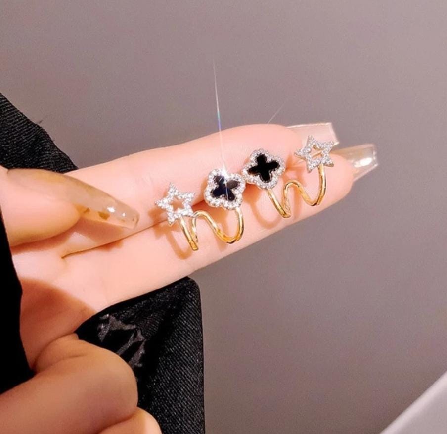 Black Gold Plated Korean Style Adjustable Clover & Flower Earring Set For Girls/Women