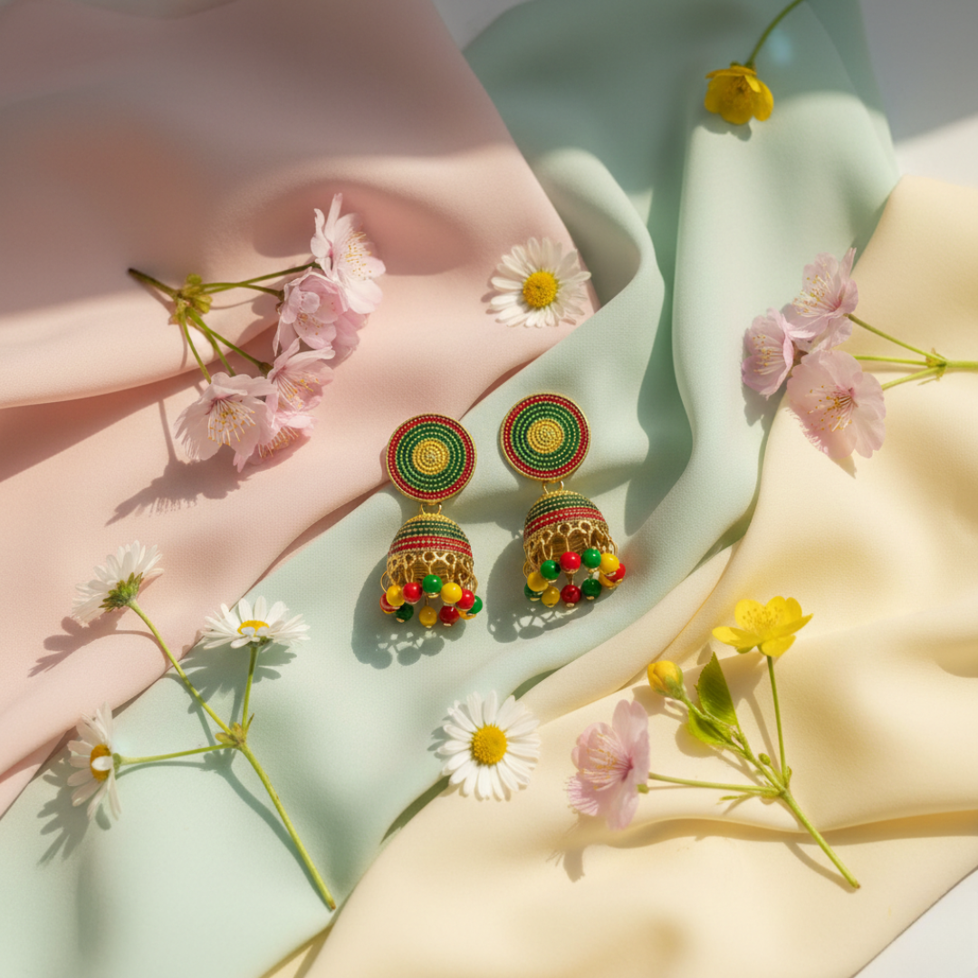 Add a pop of color and tradition to your look with these beautifully handcrafted multicolor jhumki earrings. Designed with intricate beaded detailing and vibrant shades of red, green, and yellow, these jhumkis reflect the charm of authentic Indian ethnic jewelry.