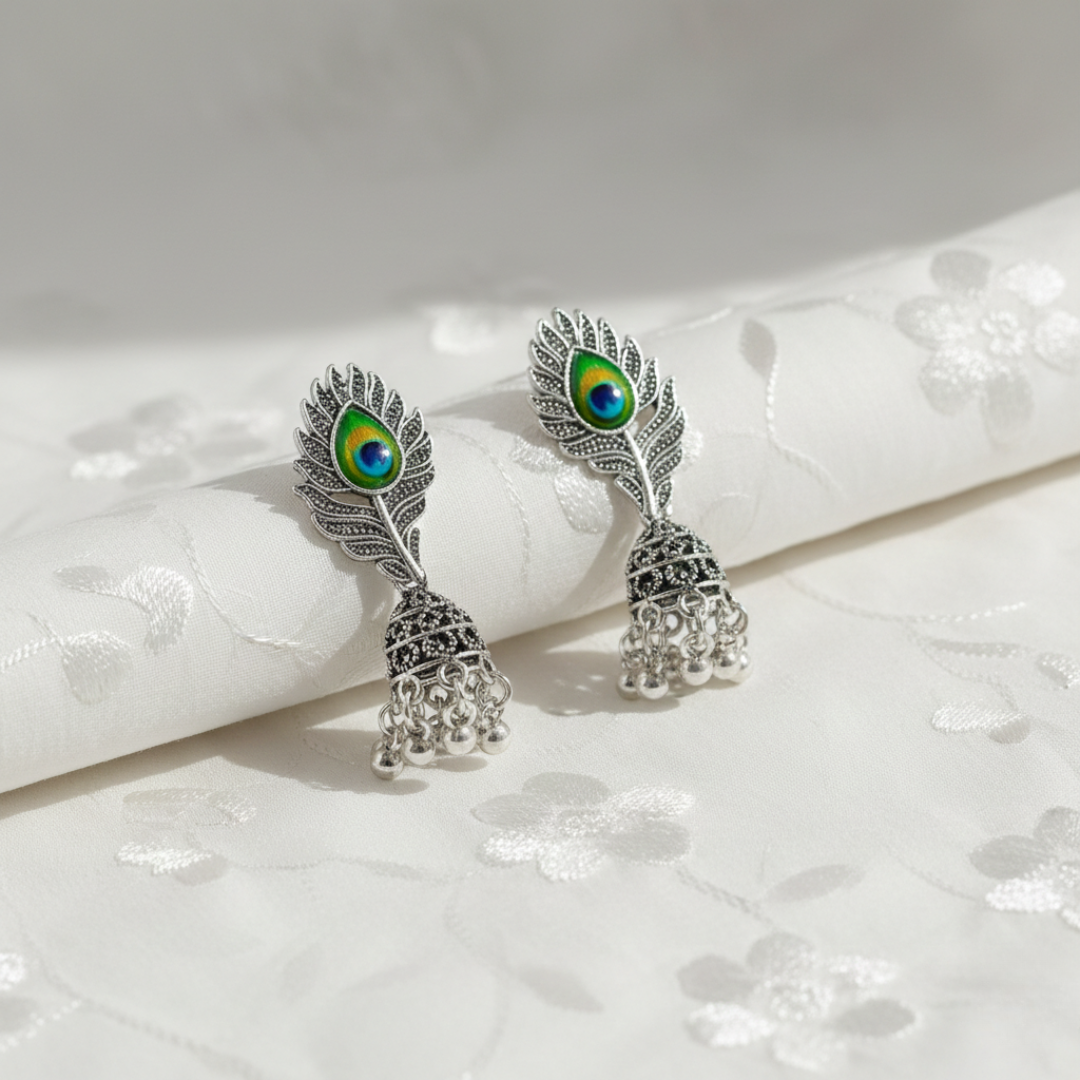 Peacock Feather Silver Jhumki Earrings | Oxidised Traditional Jhumkas for Women