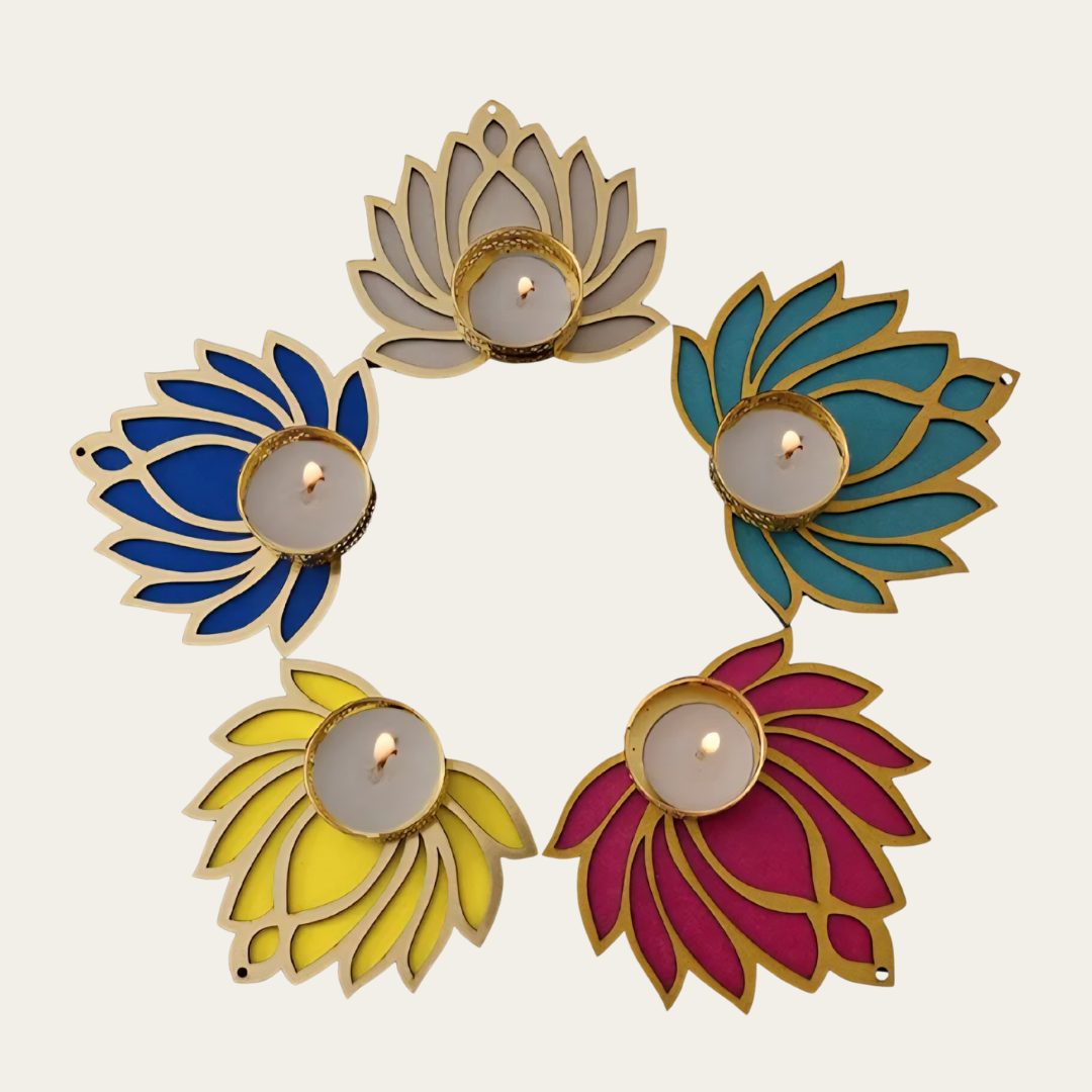 Bring festive charm and divine brightness to your home with this Set of 5 Lotus Tealight Holder Decorative Diyas. Crafted in vibrant multicolors with golden detailing, these beautiful lotus-shaped diyas are perfect for enhancing rangolis, pooja setups, centerpieces, and festive decorations.